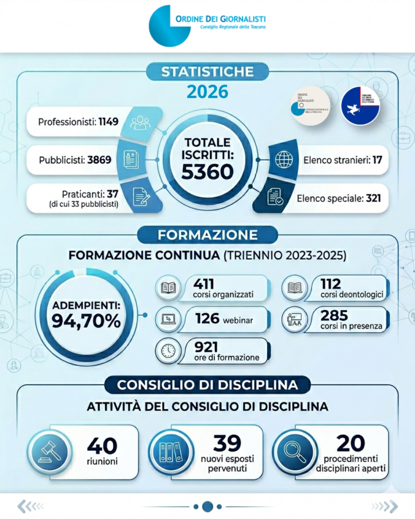 A marzo 2026 il numero dei giornalisti iscritti all’Ordine della Toscana è risultato in lieve calo con 5360 iscritti, a fronte dei 5.374 del 2025. Tra questi, 1.149 sono professionisti, 3.869 pubblicisti, 37 praticanti di cui 33 già iscritti nell’Elenco Pubblicisti, 321 iscritti nell’Elenco Speciale e 17 stranieri.