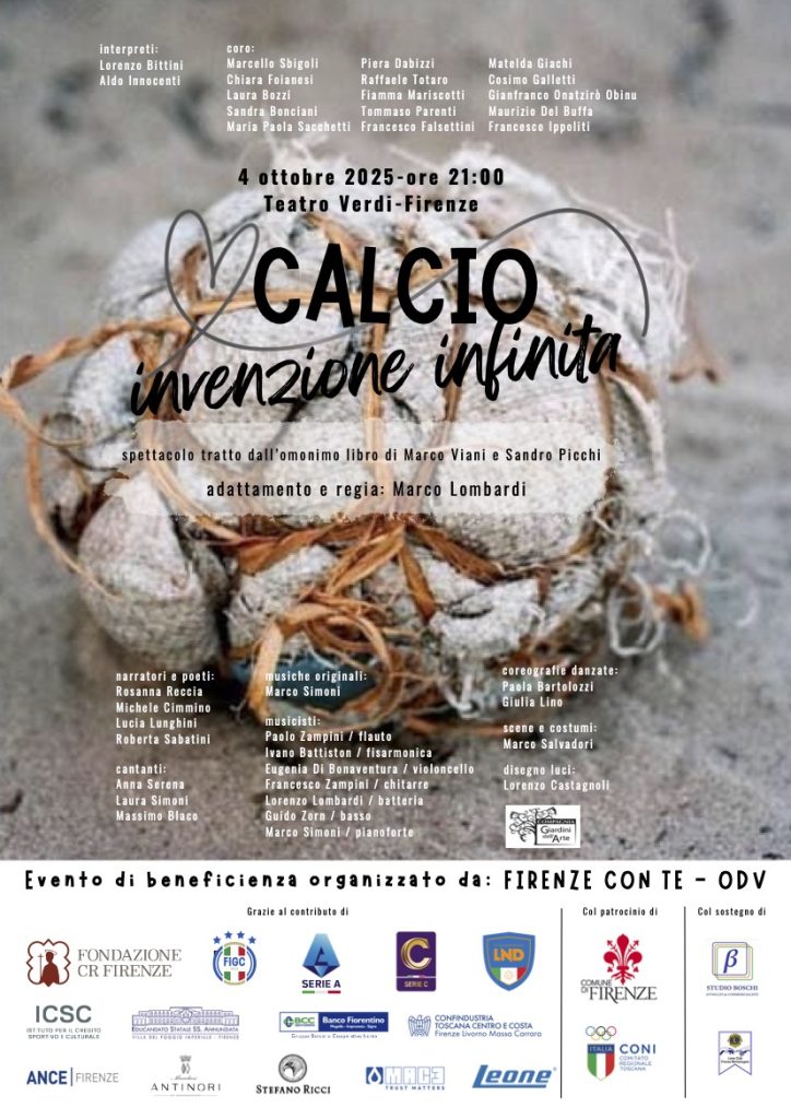 30 artisti sul palco accompagnati da musica dal vivo con i professori del Conservatorio Cherubini: è lo spettacolo di solidarietà “Calcio invenzione infinita. C’era una volta una palla di stracci – La meravigliosa storia del gioco più amato del mondo” che si terrà sabato 4 ottobre 2025 a Firenze.