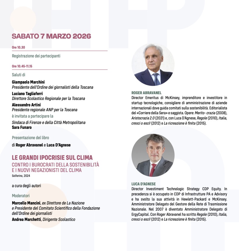 La crisi climatica, i parametri ESG (Environmental, Social, Governance), la sostenibilità tra burocrazia e ritardi: sono alcuni dei temi affrontati nel libro “Le Grandi Ipocrisie sul clima, contro i burocrati della sostenibilità e i nuovi negazionisti del clima” scritto da Roger Abravanel e Luca D’Agnese.