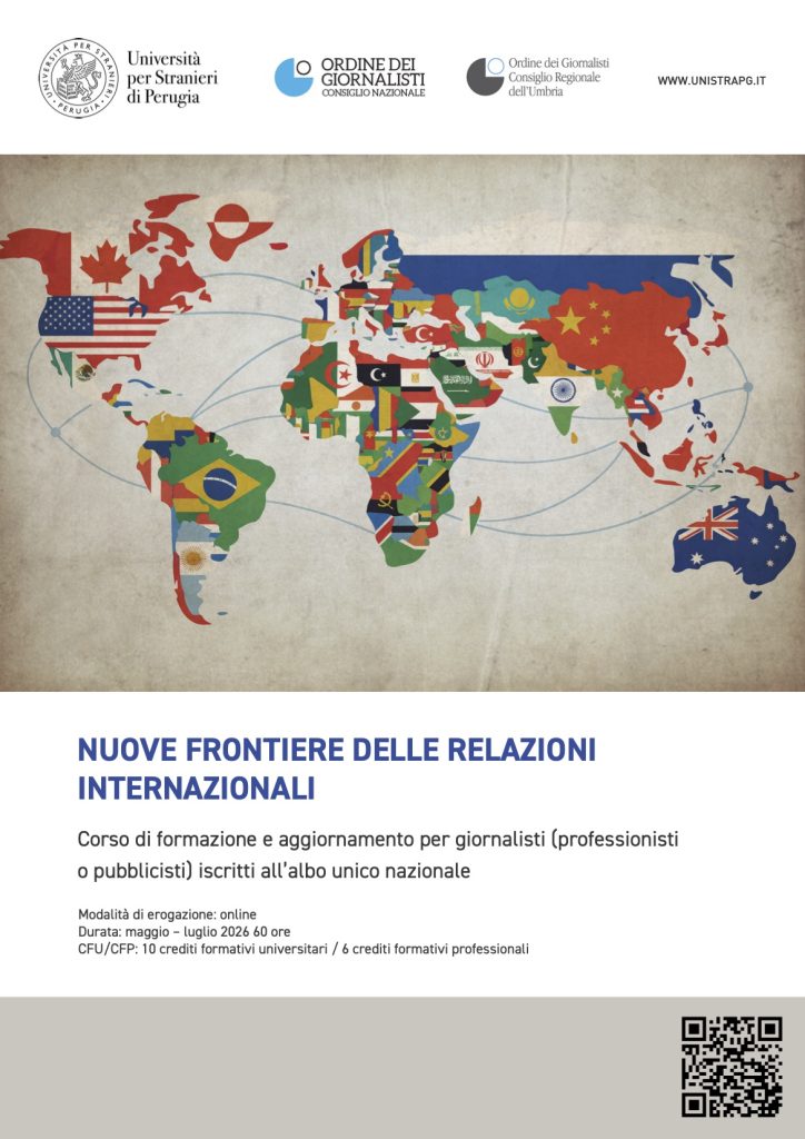 Offrire strumenti aggiornati per interpretare un contesto globale caratterizzato da una crescente complessità e da un forte impatto sulle dinamiche comunicative: è l’obiettivo del corso “Nuove frontiere delle relazioni internazionali” 2025-2026, promosso da Ordine dei giornalisti dell’Umbria e Università per Stranieri di Perugia in collaborazione con il Consiglio Nazionale dell’Ordine dei Giornalisti.