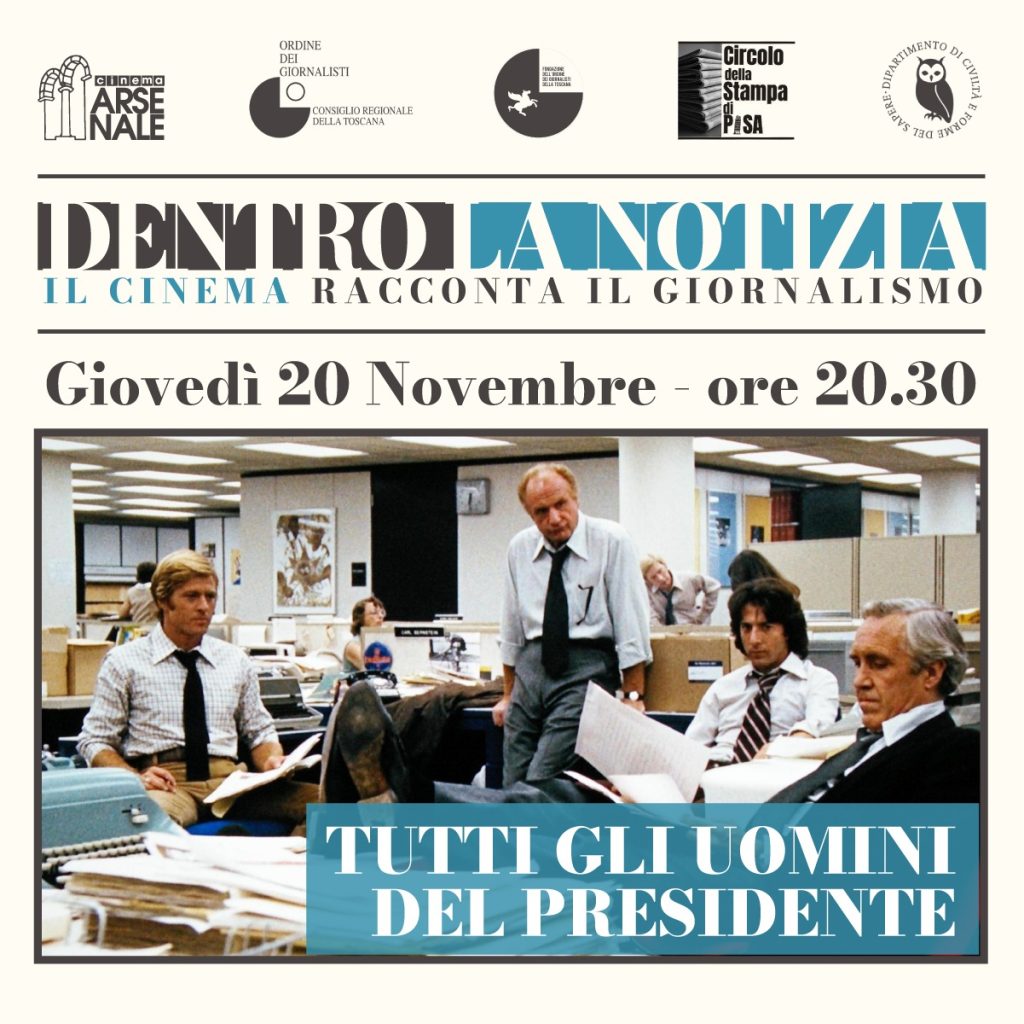 La rassegna cinematografica è realizzata dal Cineclub Arsenale in collaborazione con l’Ordine dei Giornalisti della Toscana, la Fondazione dell’Ordine dei Giornalisti delle Toscana e il neonato Circolo della Stampa di Pisa, in occasione del laboratorio di comunicazione giornalistica che OdG Toscana coordina nell’ambito del corso di studi in Comunicazione Media e Tecnologie del Dipartimento di Civiltà e forme del sapere dell’Università di Pisa.
